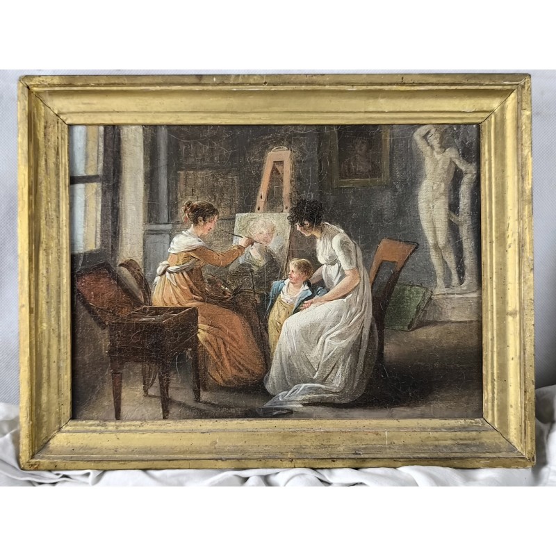Ce charmant tableau représentant une femme peignant le portrait d’un enfant tenu par une autre femme nous fait pénétrer dans un atelier privé du début du XIXᵉ siècle.